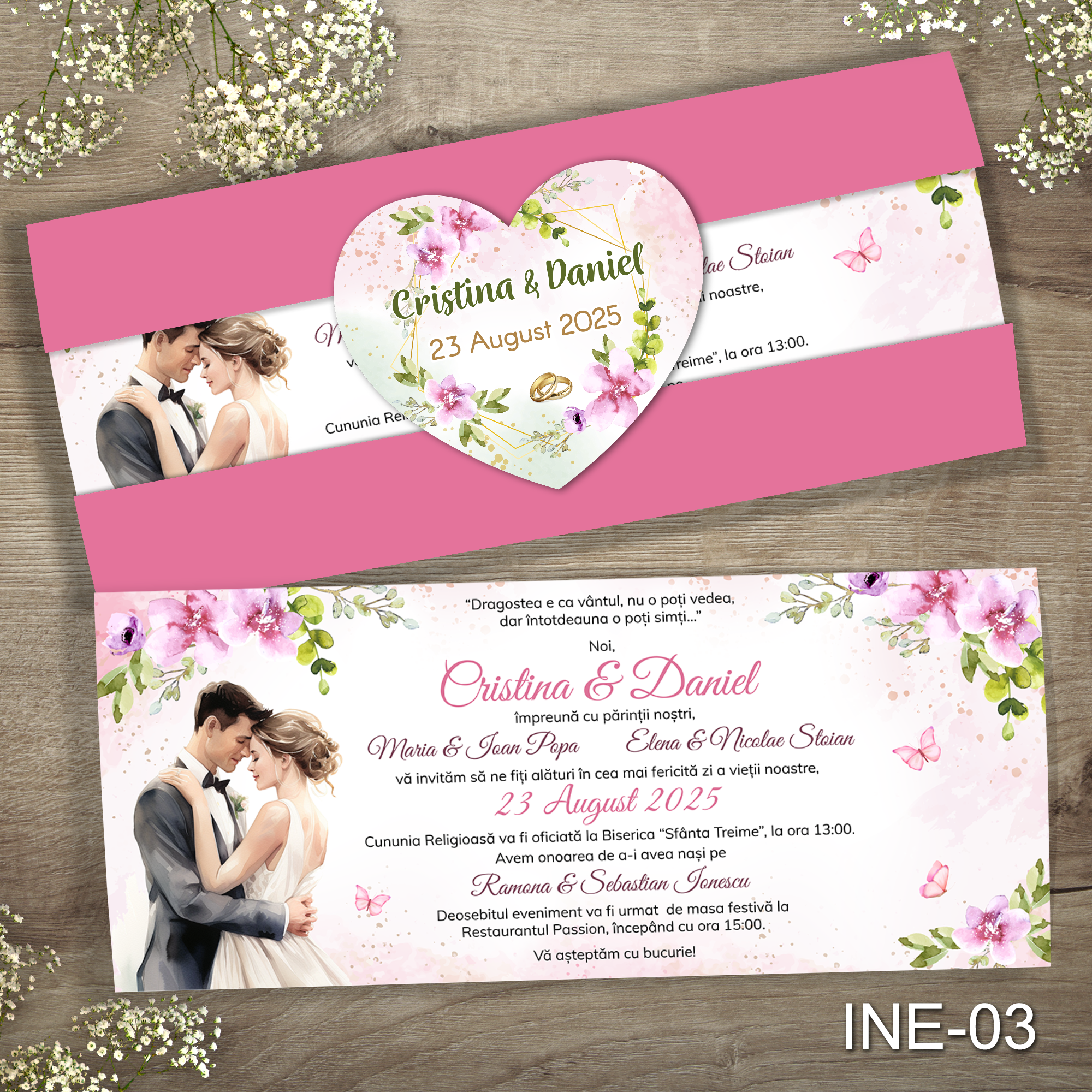 Invitatii nunta cu eticheta si plic Roz – INE-03