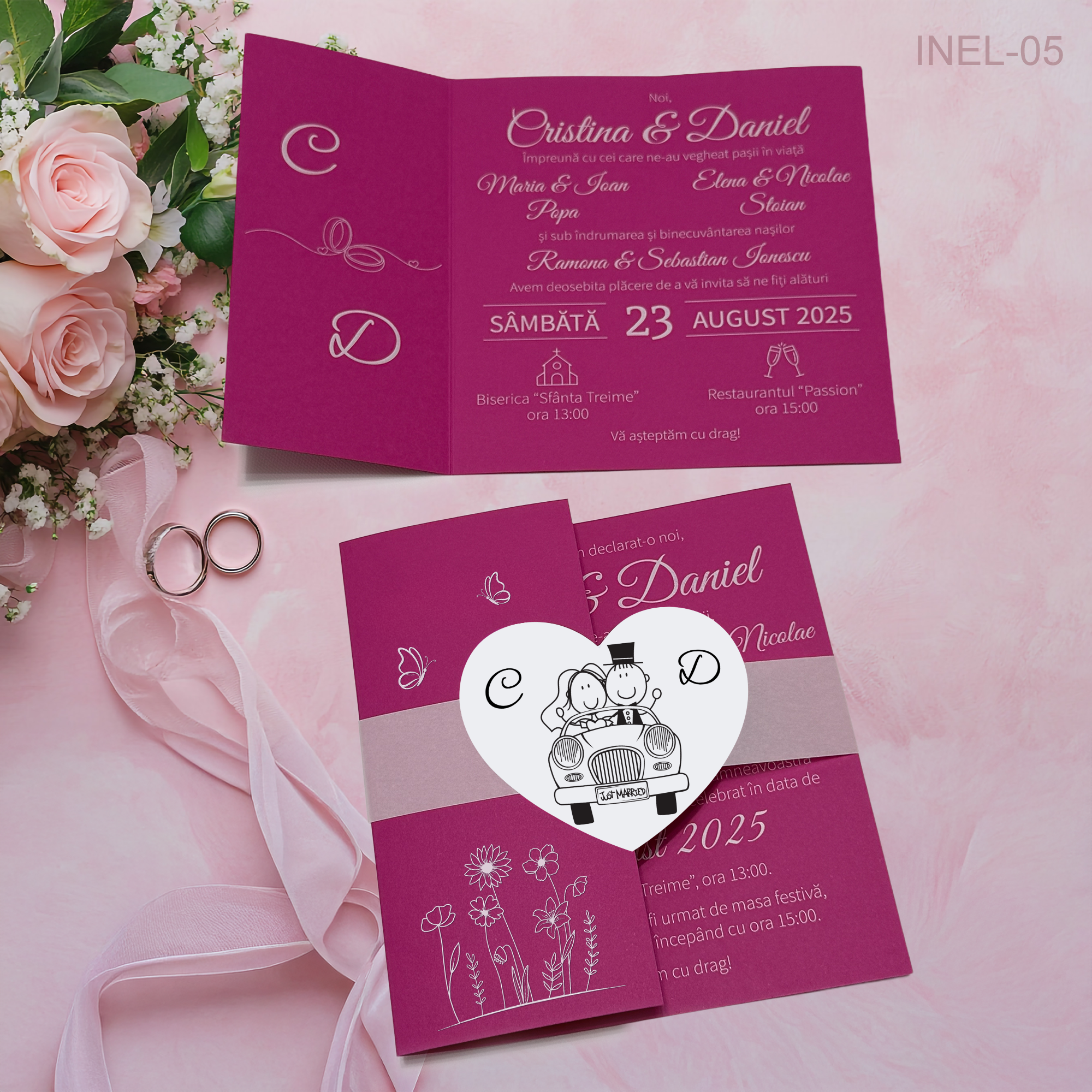 Include: invitație pliabilă + bandă decorativă + etichetă în formă de inimă